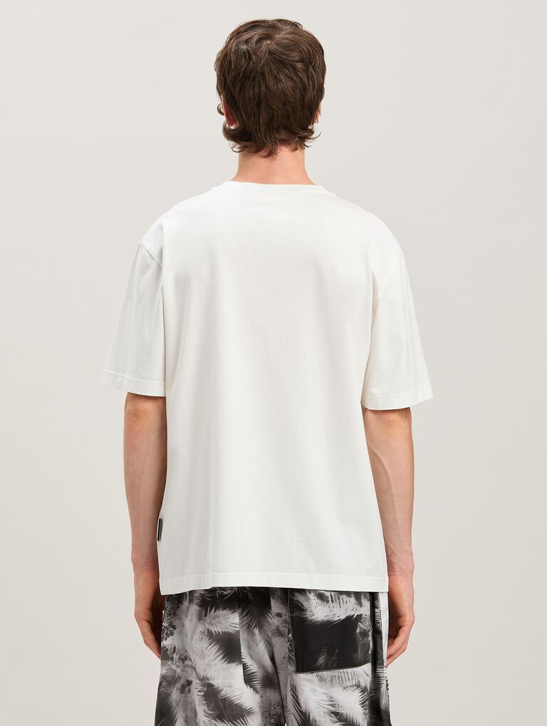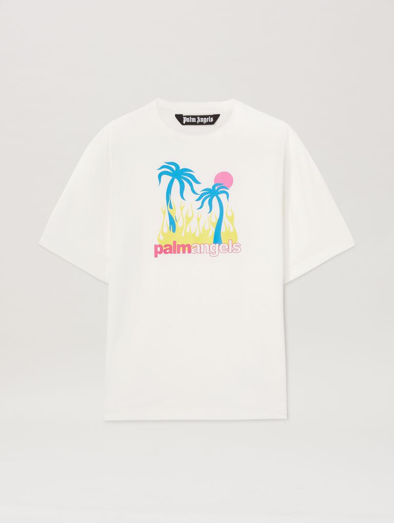 Palm Angels Clothings presents the Burning Oasi Slim Tee Off White, a rebellious statement tee that perfectly encapsulates the brand’s Italian luxe-meets-street vibe. This slim-fit tee in soft cotton jersey offers a lightweight feel, durability, and a refined silhouette. The Burning Oasi graphic at the front creates a super dynamic, eye-catching detail, while the Palm Angels logo on the rib gives a definitive touch on high end streetwear identity. The off-white shade gives a neutral background to bring the vivid design to life that allows you to style it up or down. Palm Angels T-Shirt ideal for casual or statement ensembles. A great buy for fans of art-inspired fashion and modern street sensibilities.